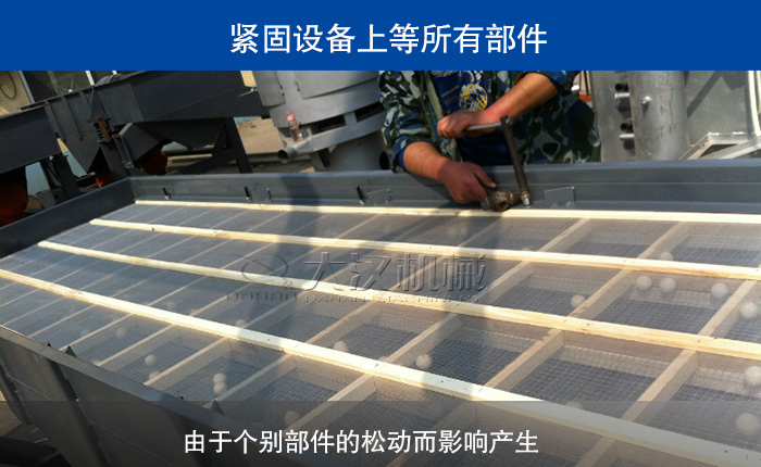 對重型振動篩設備上的所有部件進行排查,看看是否出現松動,并及時加以緊固,特別是需要經常更換的篩板,避免由于個別部件的松動而產生的額外振動。